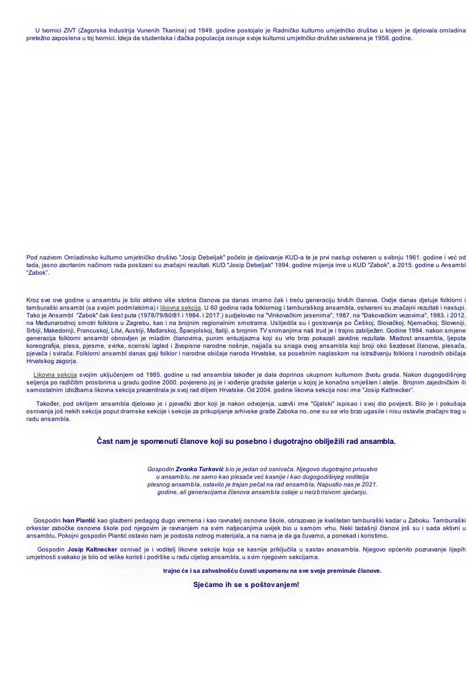 Ansambl ZABOK CERTIFIKAT VRSNOĆE foka-KAOF-1311958. - OMLADINSKO KULTURNO-UMJETNIČKO DRUŠTVO „JOSIP DEBELJAK“ ​• 1994. - KULTURNO-UMJETNIČKO DRUŠTVO ZABOK • 2015. - ANSAMBL ZABOKPovijest…KALENDARSenior klub 2014